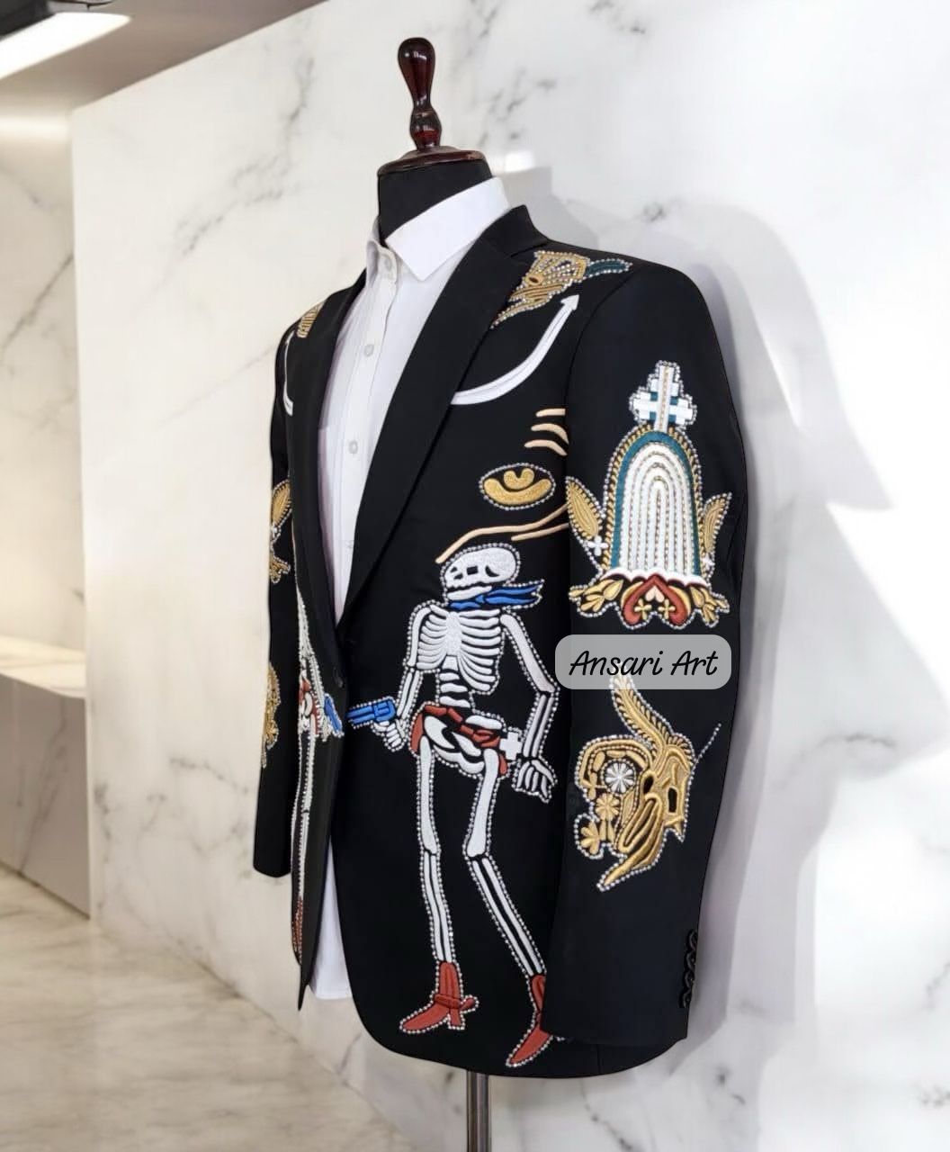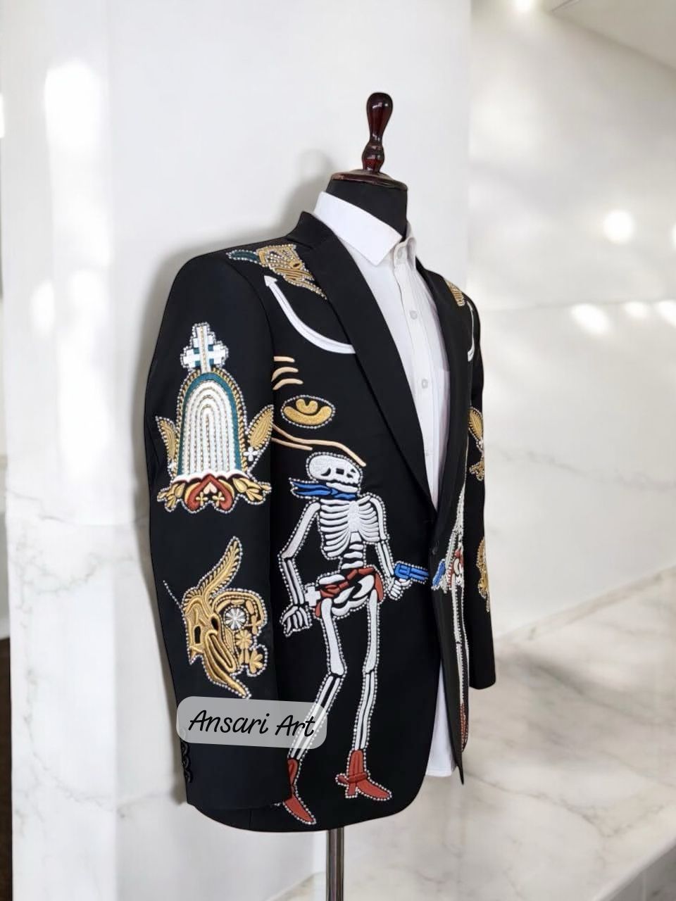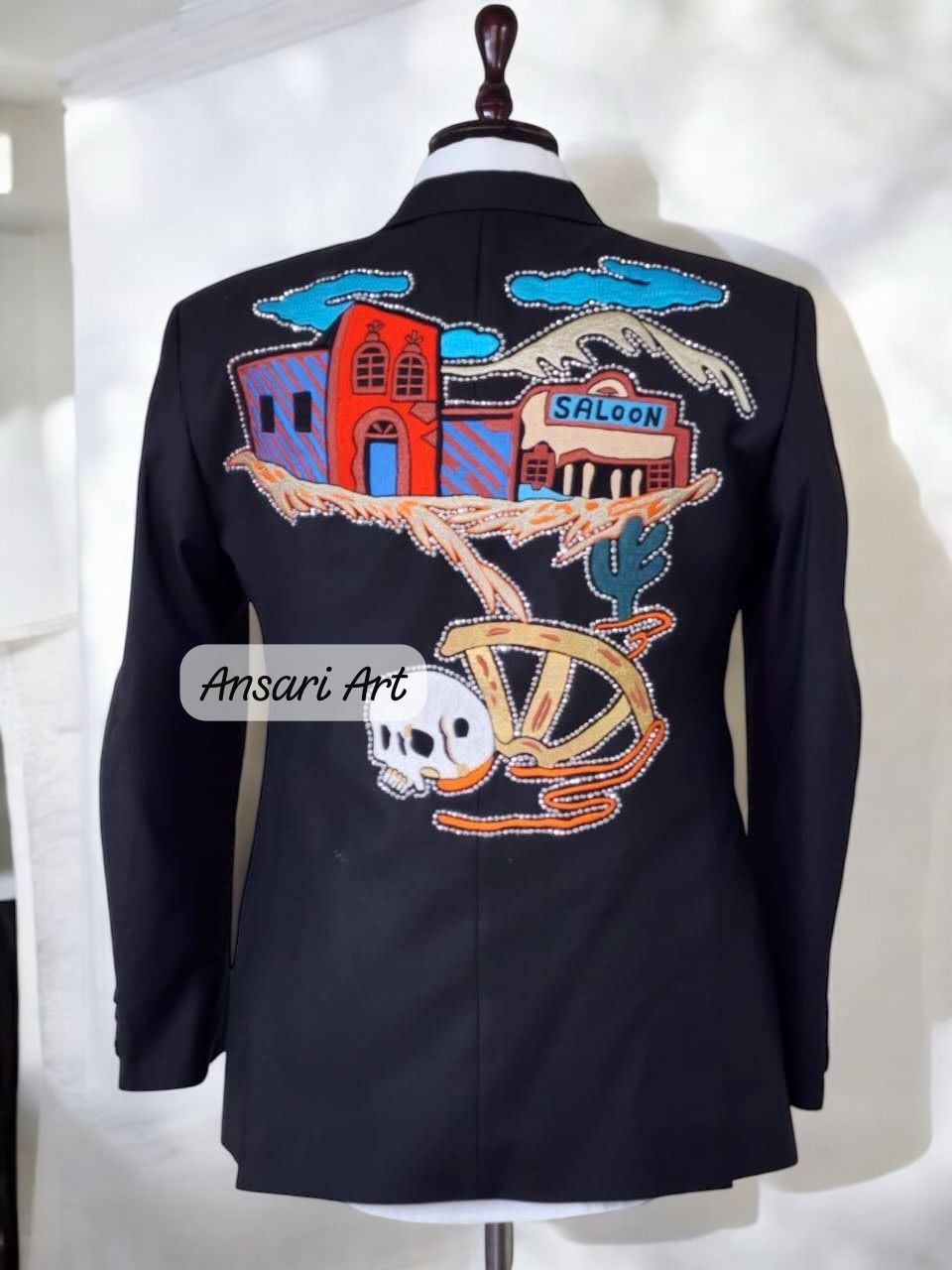 Stand out with this hand embroidered black statement suit, inspired by gothic and western art. Featuring intricate skeleton, desert, and symbolic motifs, this suit is carefully crafted by hand to create a bold, artistic look that cannot be replicated by machines or prints.