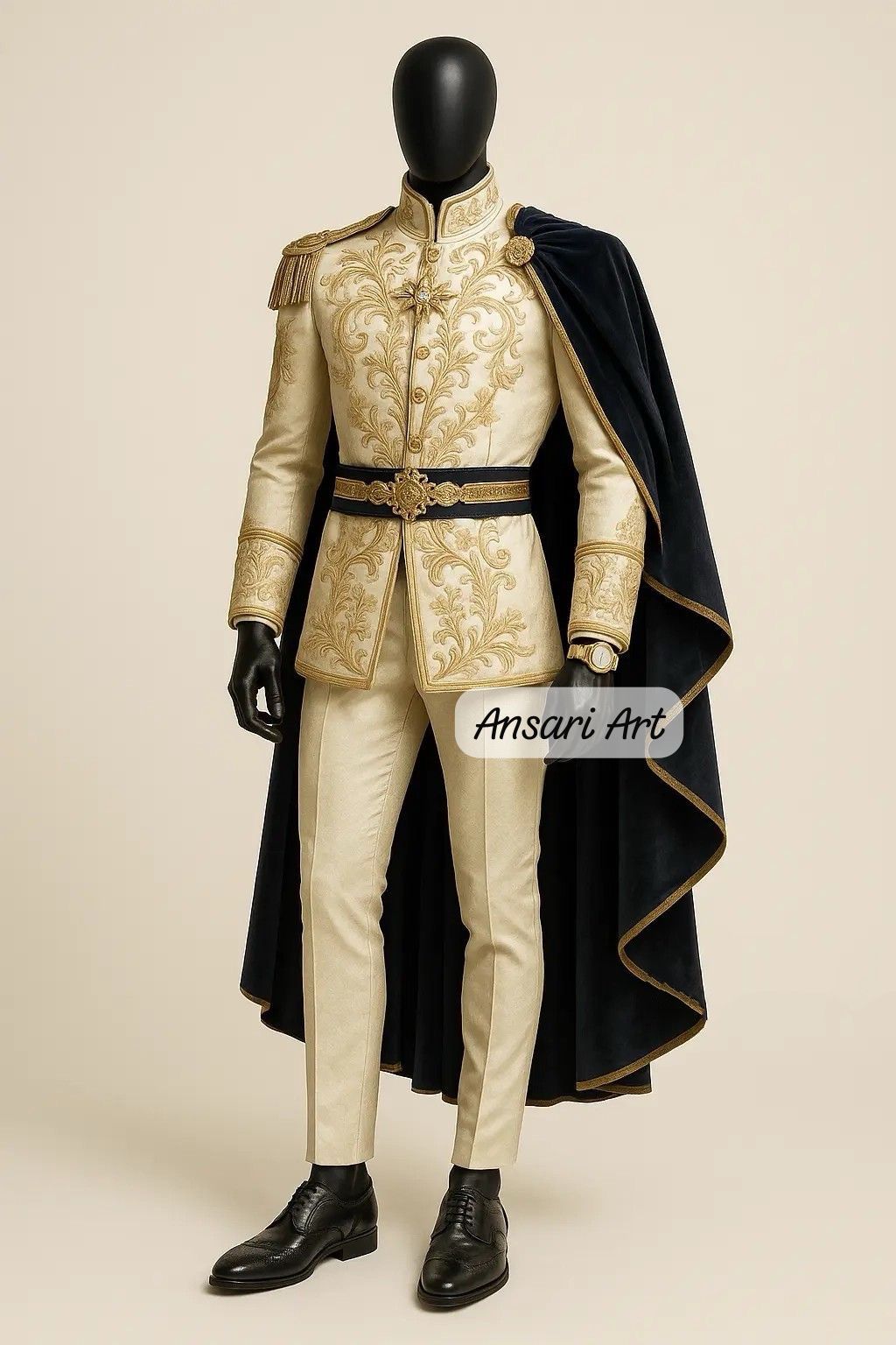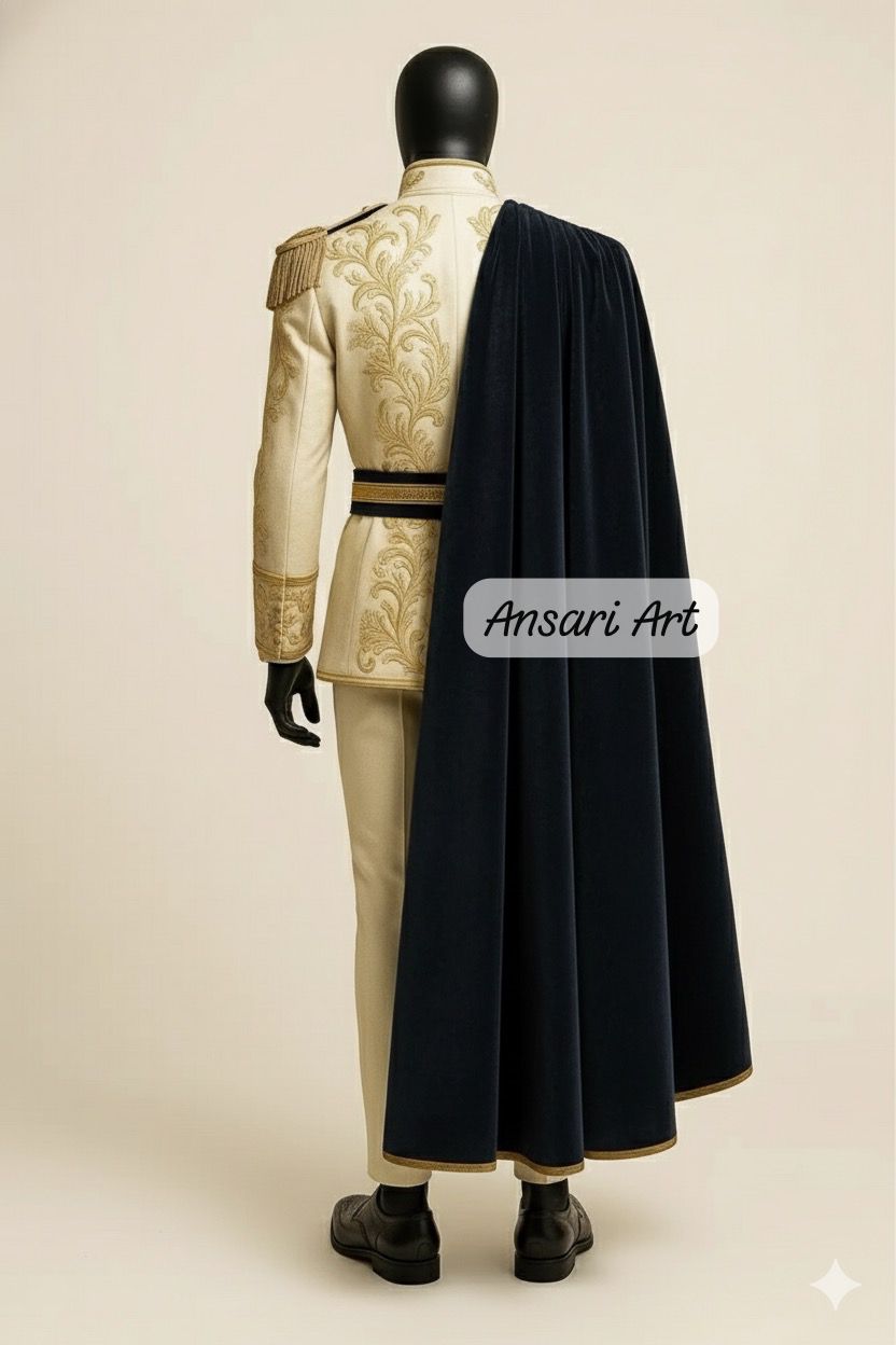 Bespoke Royal Prince Costume – Cream & Gold Embroidered Military Tunic with Navy Velvet Cape