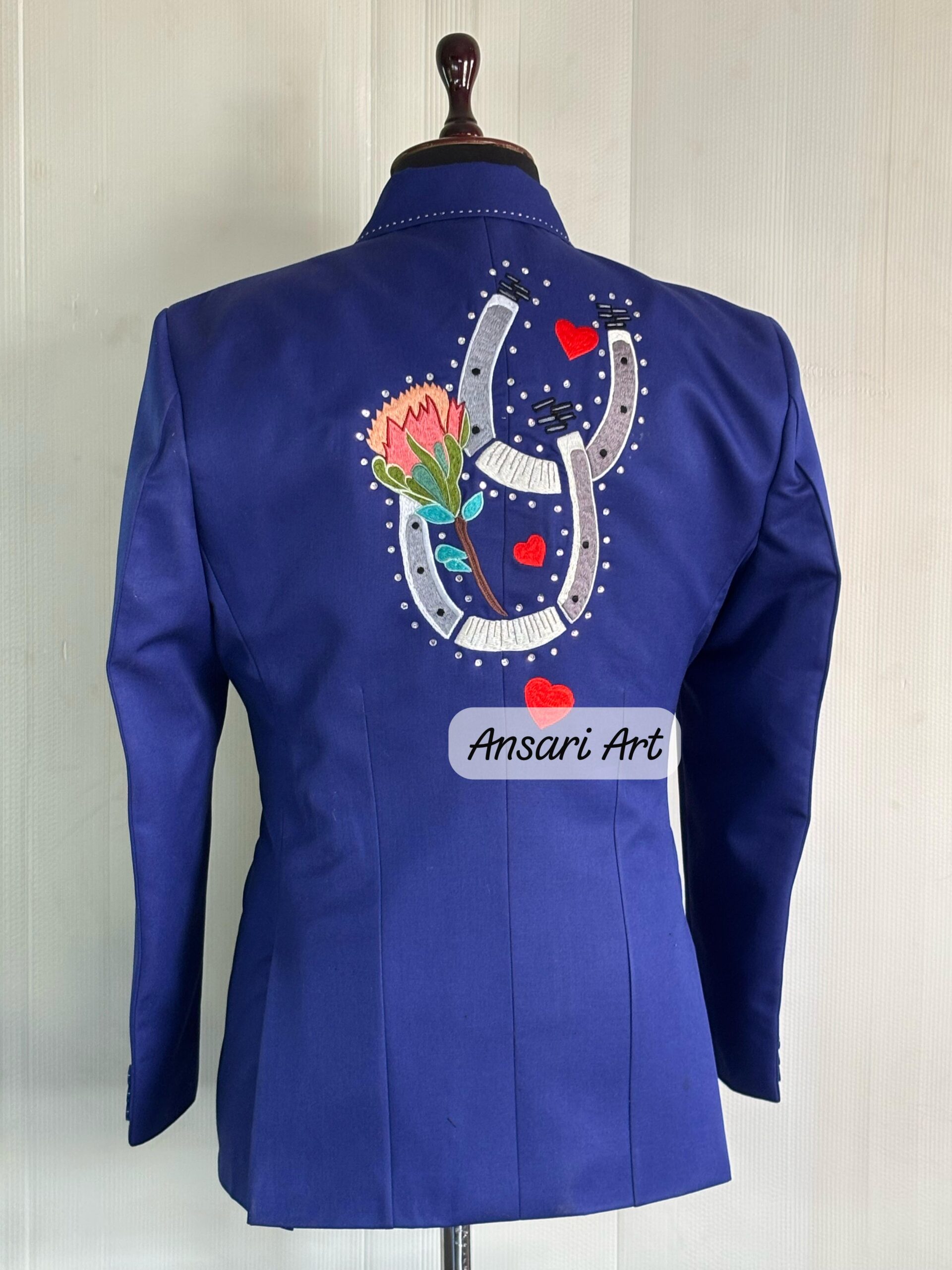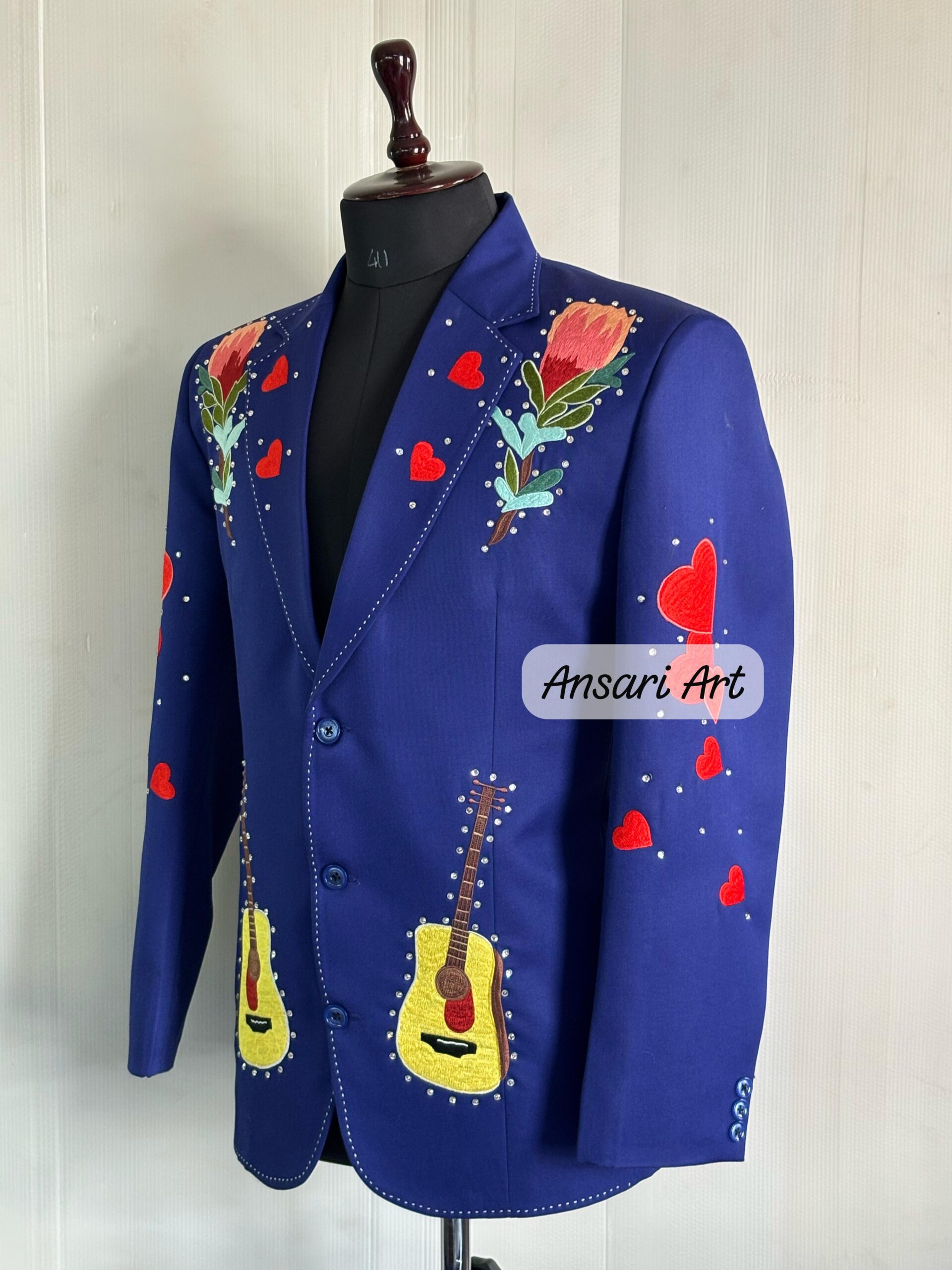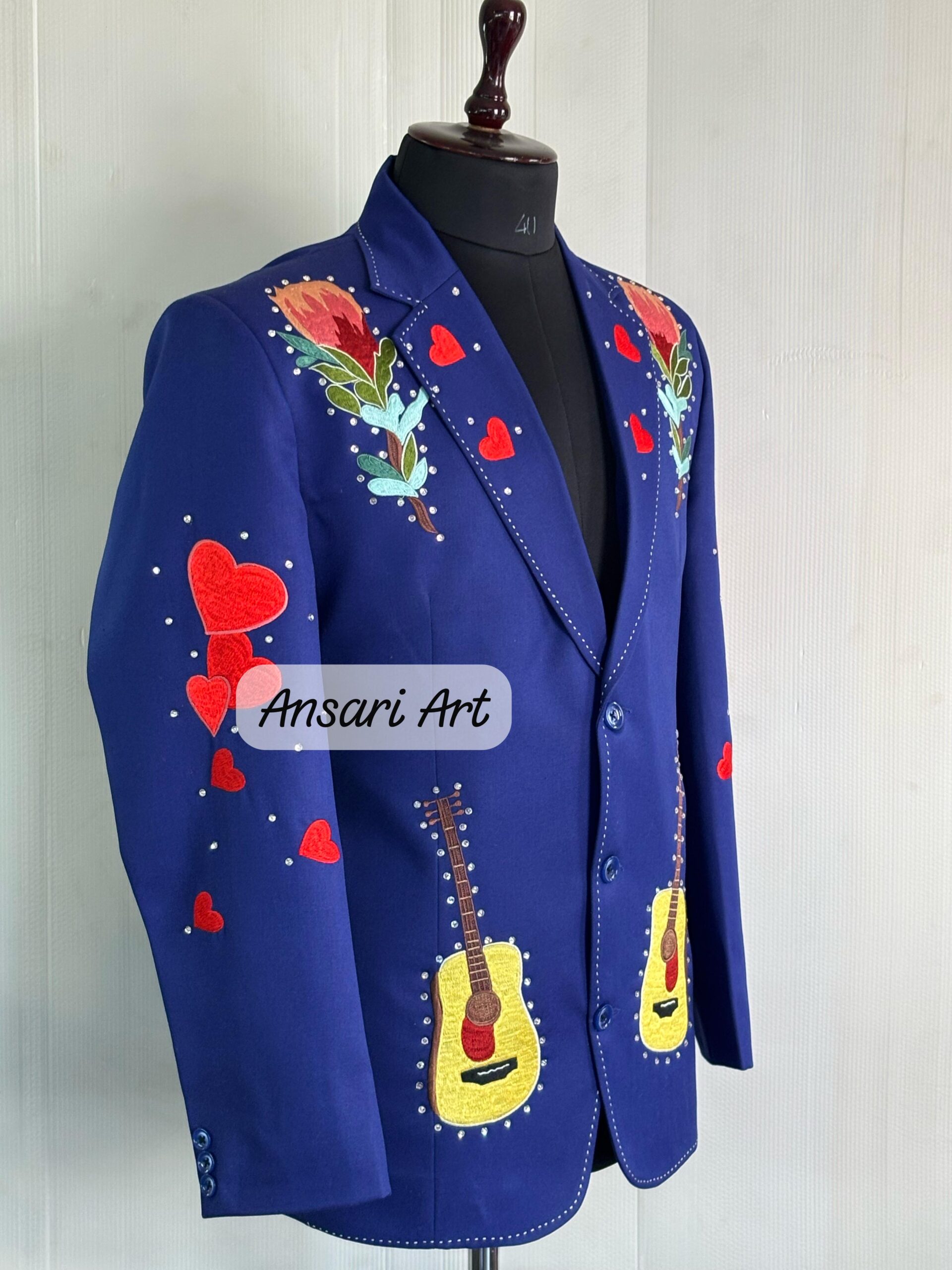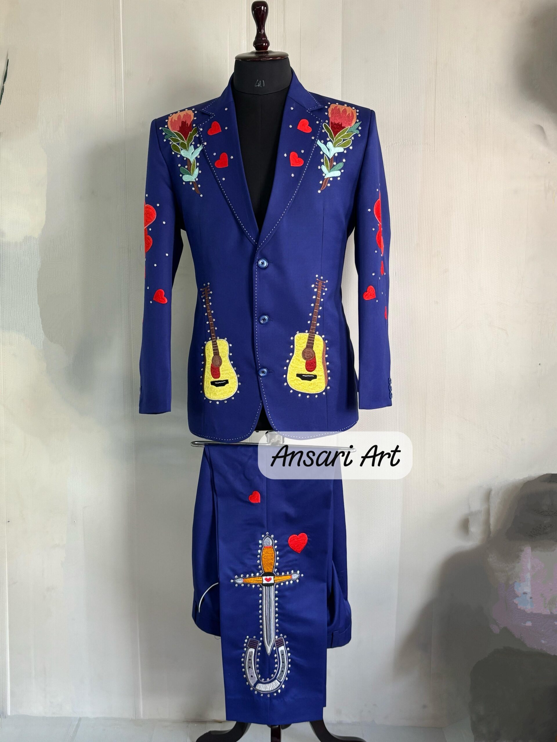 Step into the spotlight with this stunning navy blue Western suit, designed for weddings, country concerts, cowboy-themed parties, and rockstar moments. This 2-piece set (jacket & trousers) is fully customized with intricate floral and guitar embroidery, accented with rhinestones for a bold, show-stopping look.